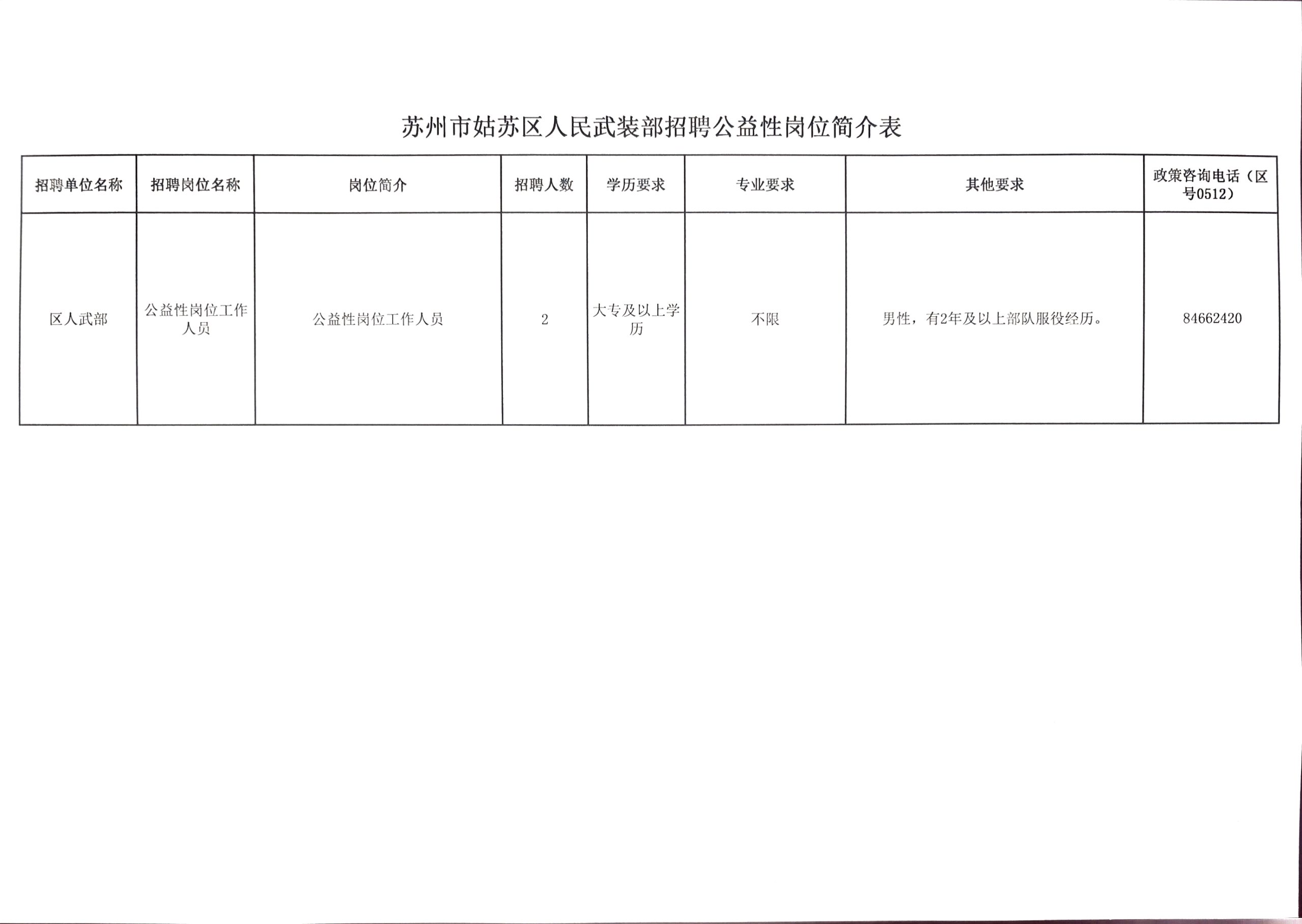 招聘岗位、人数及相关条件详见《苏州市姑苏区人民武装部招聘公益性岗位简介表》(